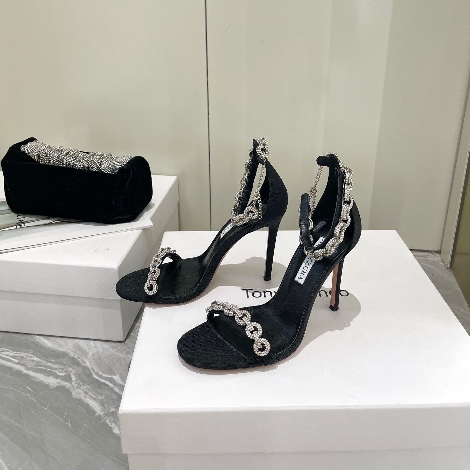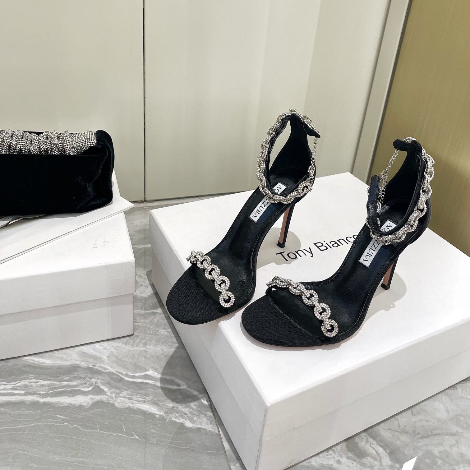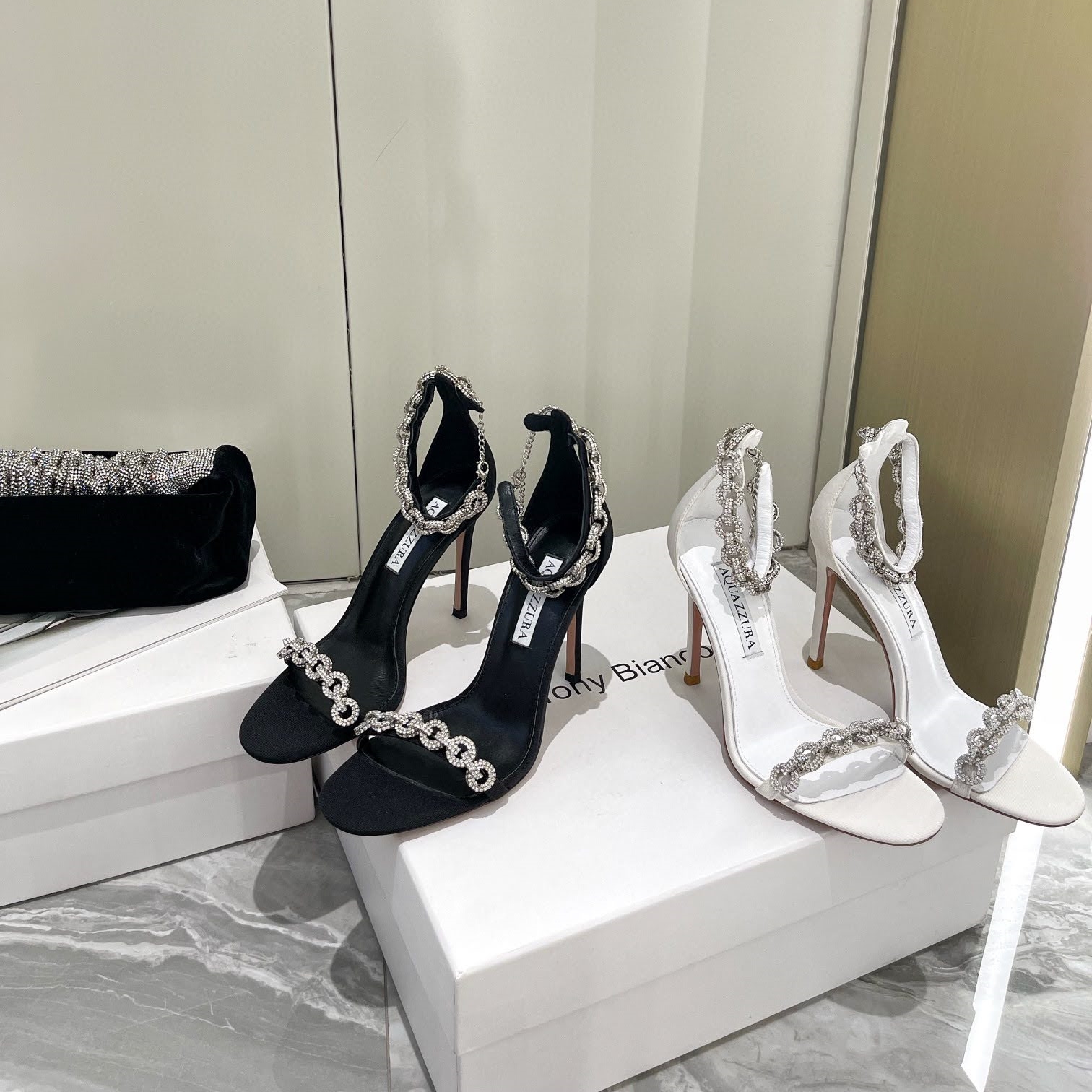아쿠아주라 보석장식 스트랩 샌들 블랙 화이트 하이힐 섹시