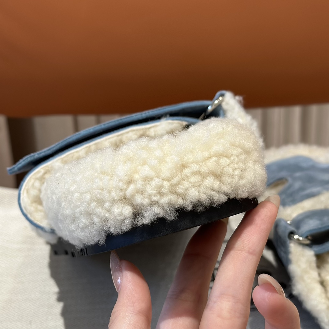 에르메스 양털 슬리퍼 시어링 블루 컬러 스웨이드 벨크로샌들 슬리퍼