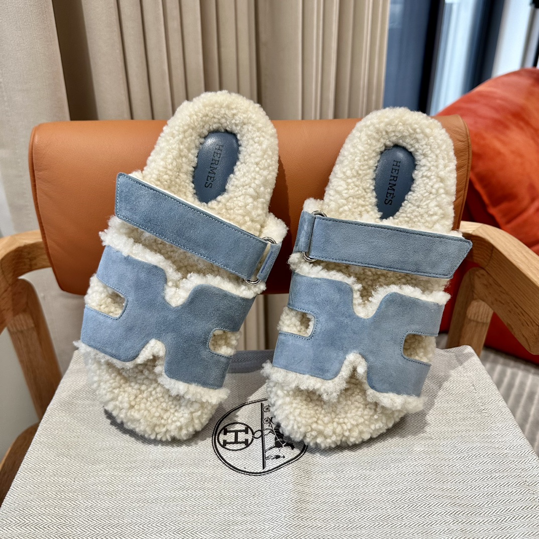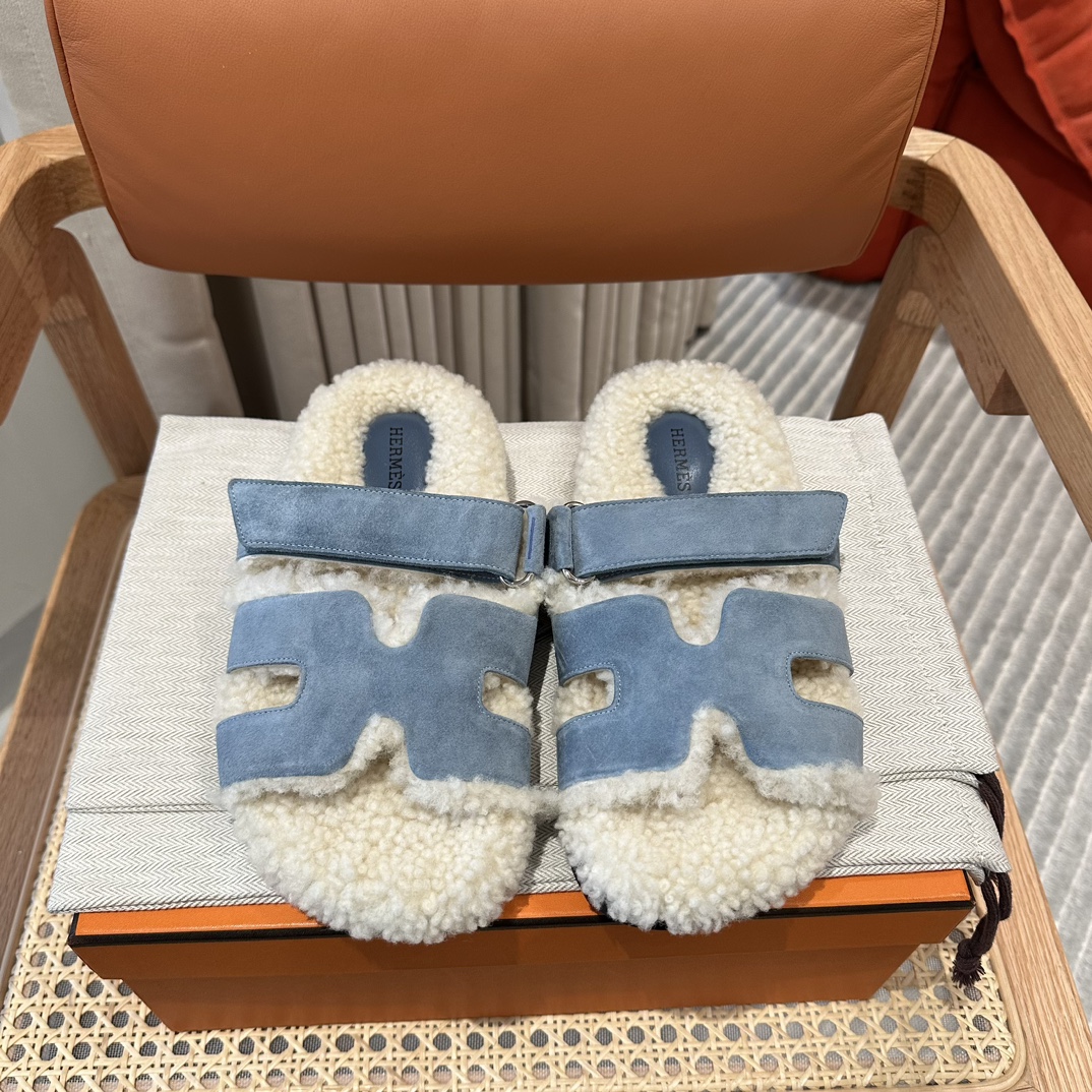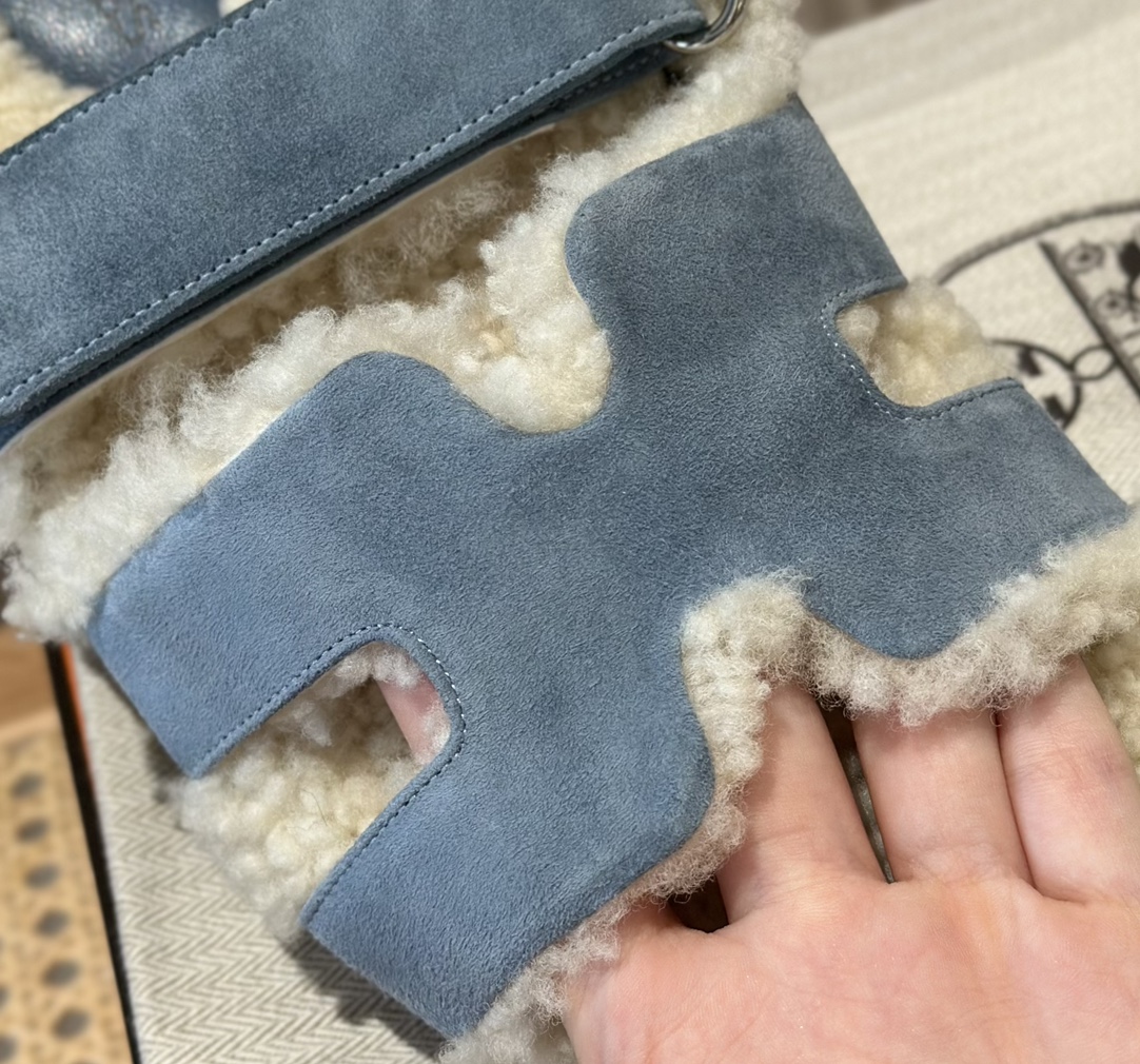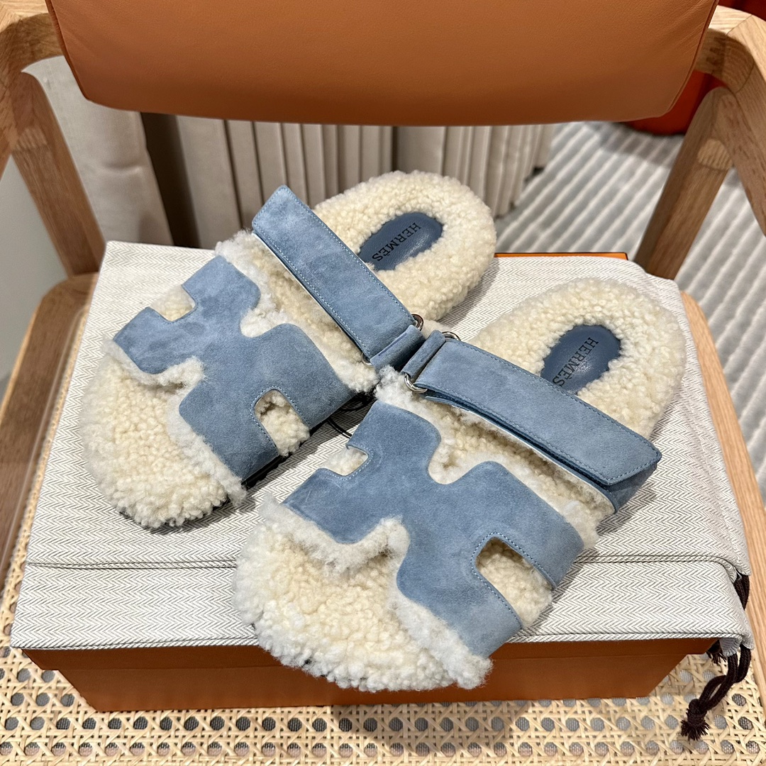 에르메스 양털 슬리퍼 시어링 블루 컬러 스웨이드 벨크로샌들 슬리퍼