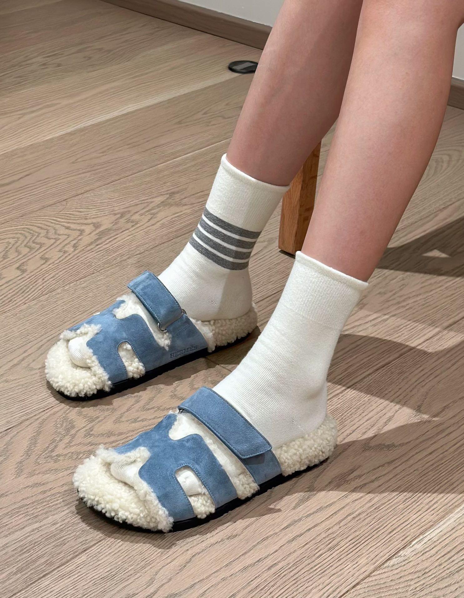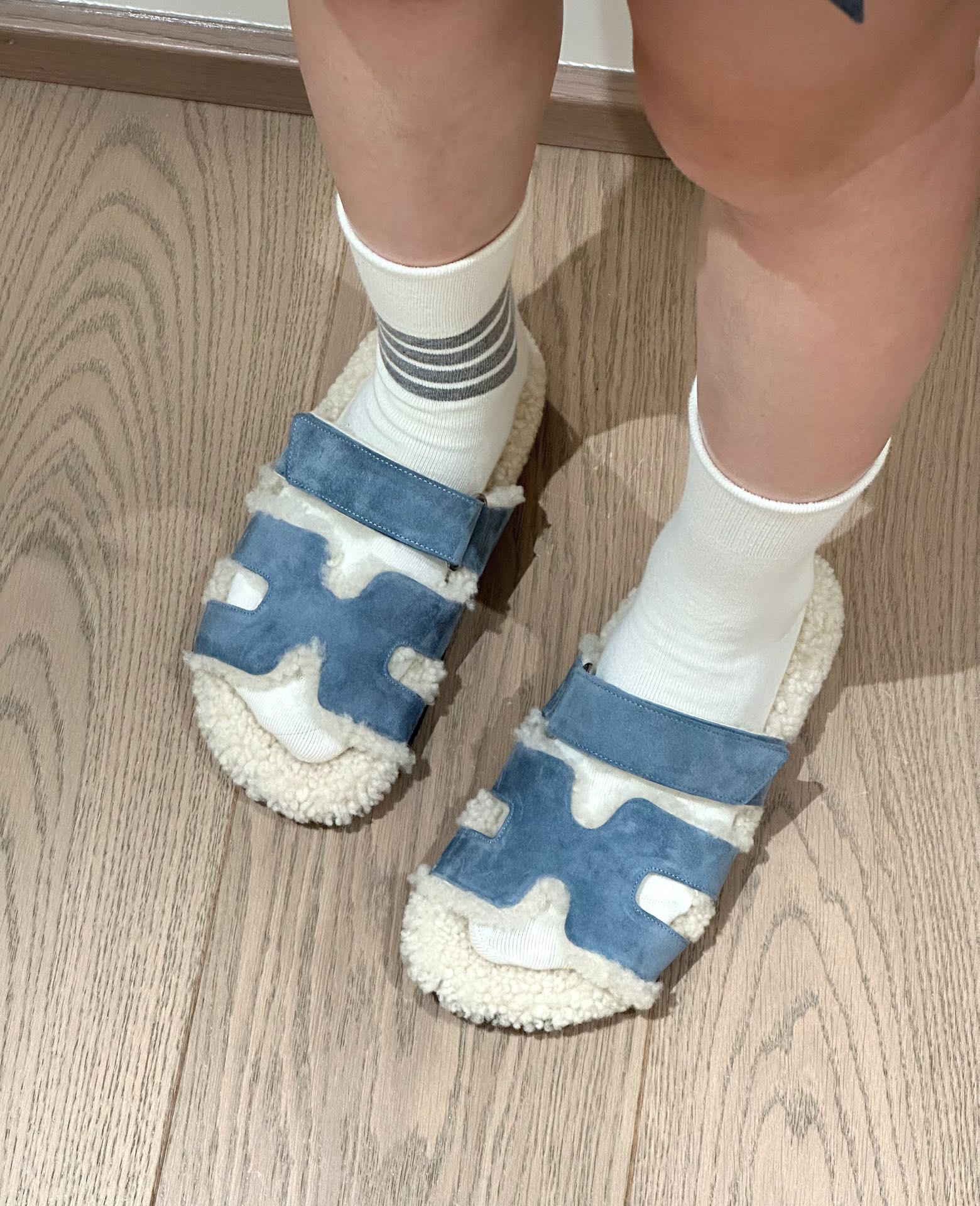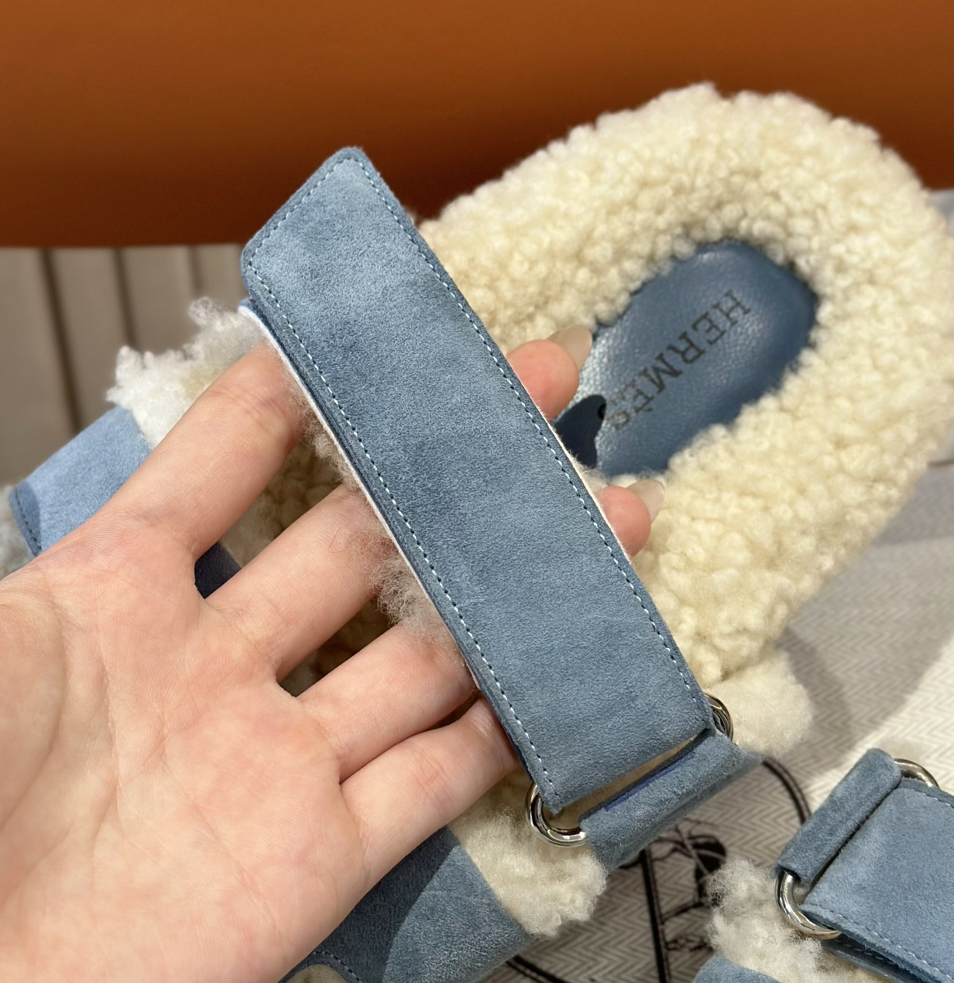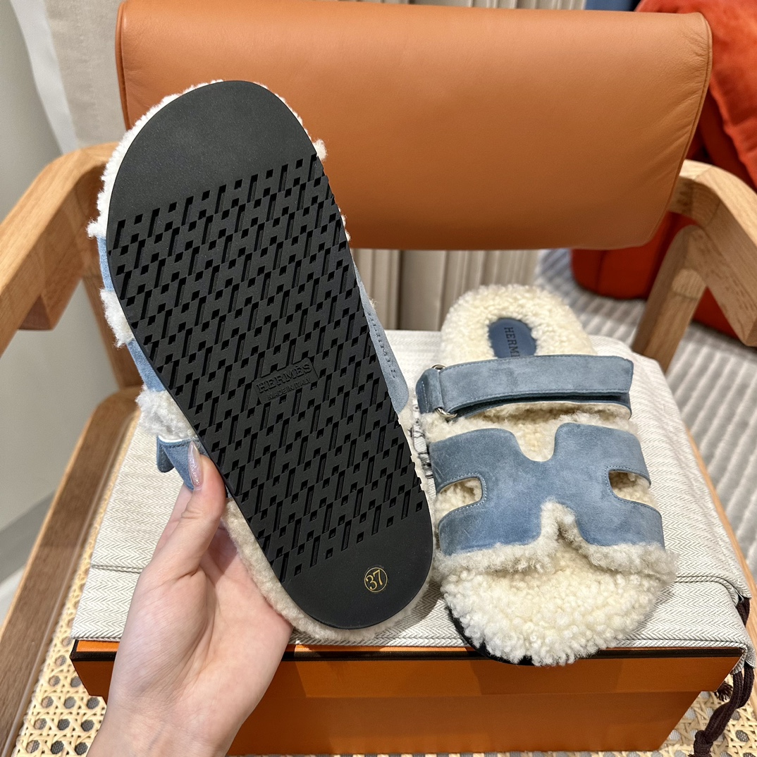 에르메스 양털 슬리퍼 시어링 블루 컬러 스웨이드 벨크로샌들 슬리퍼