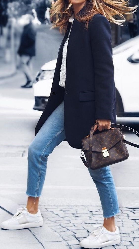 네이비 모직코트에 청바지~ 발렌티노 화이트 스니커즈